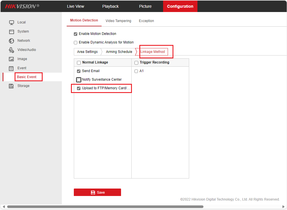 Lastly, you need to configure the Linkage Method, which means what actions to take if a motion event is detected. Click "Linkage Method", you will