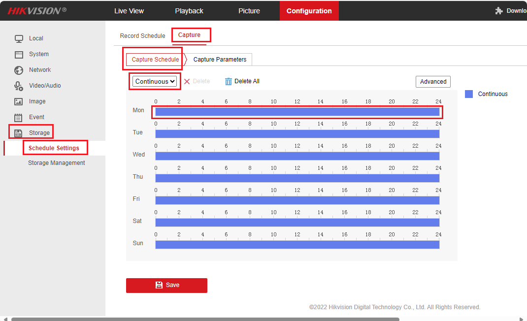 need to set the capture schedule. Click Configuration -> Storage -> Schedule Settings -> Capture -> Capture Schedule. It will display