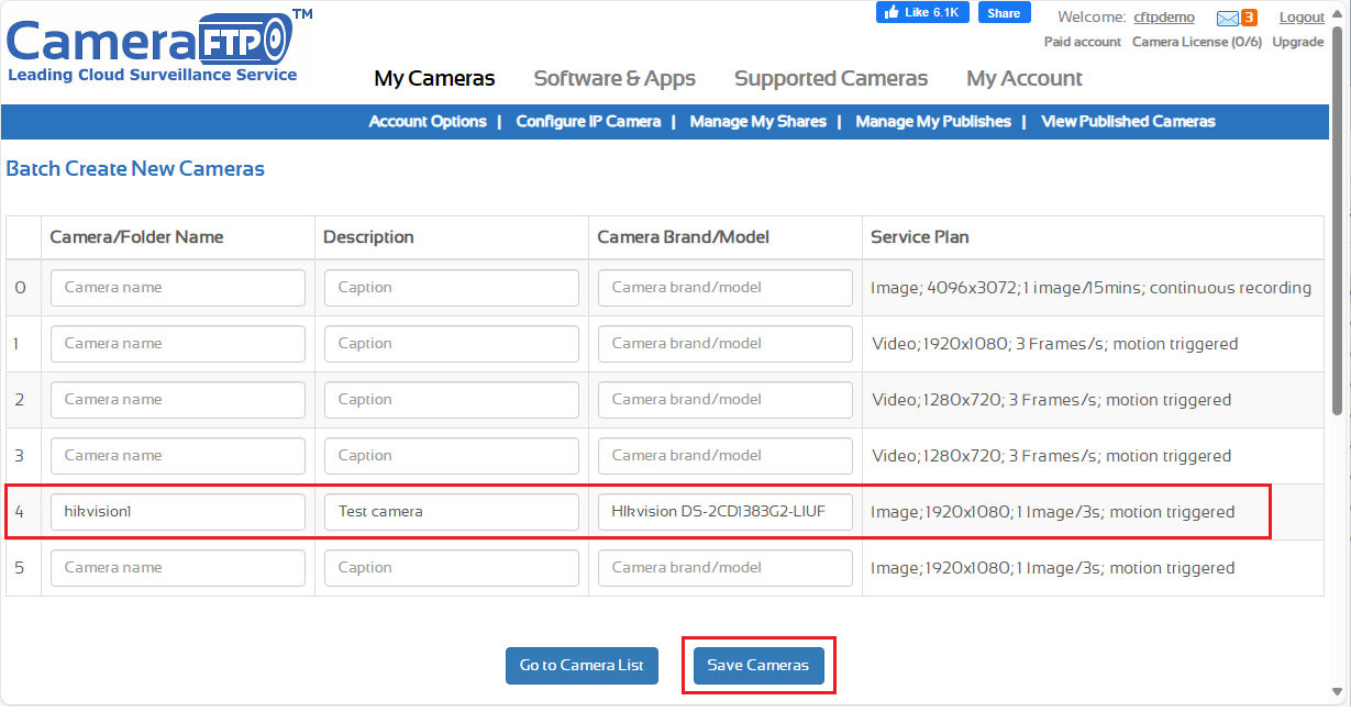 Enter the camera (folder) name, description and brand/model with a specific subscription or free plan, then click Save Cameras.