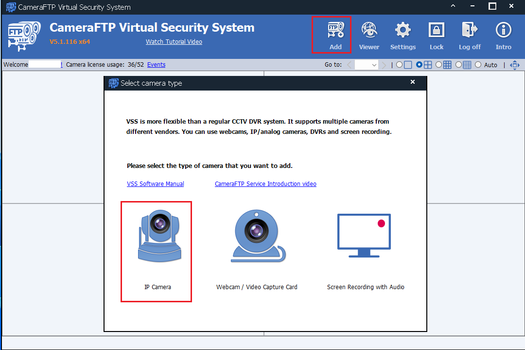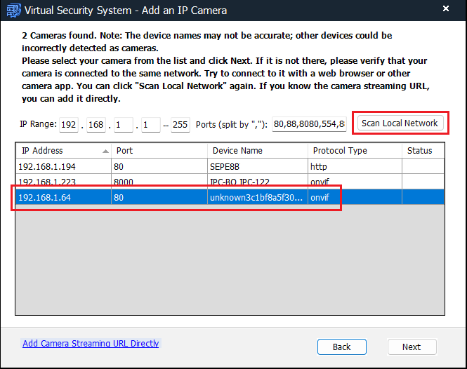 You will click Add to add a camera in VSS, then scan the local network to find IP cameras in the local network. Please see the screenshots below: