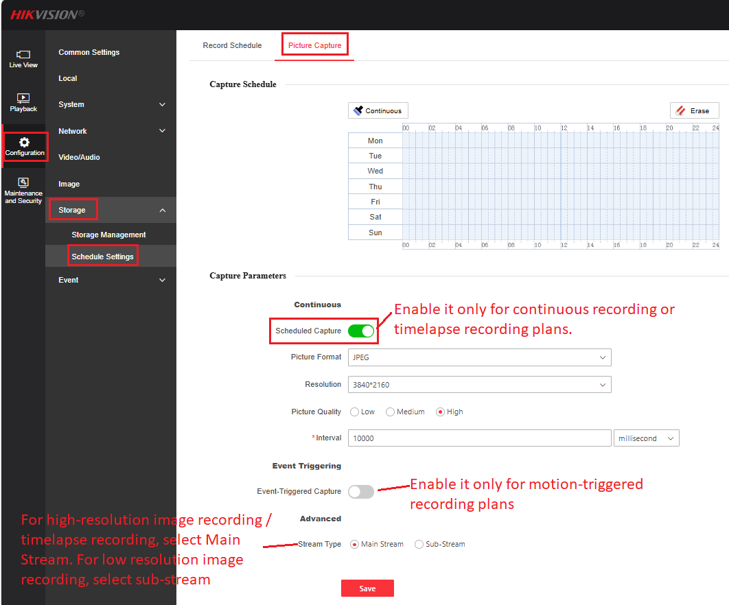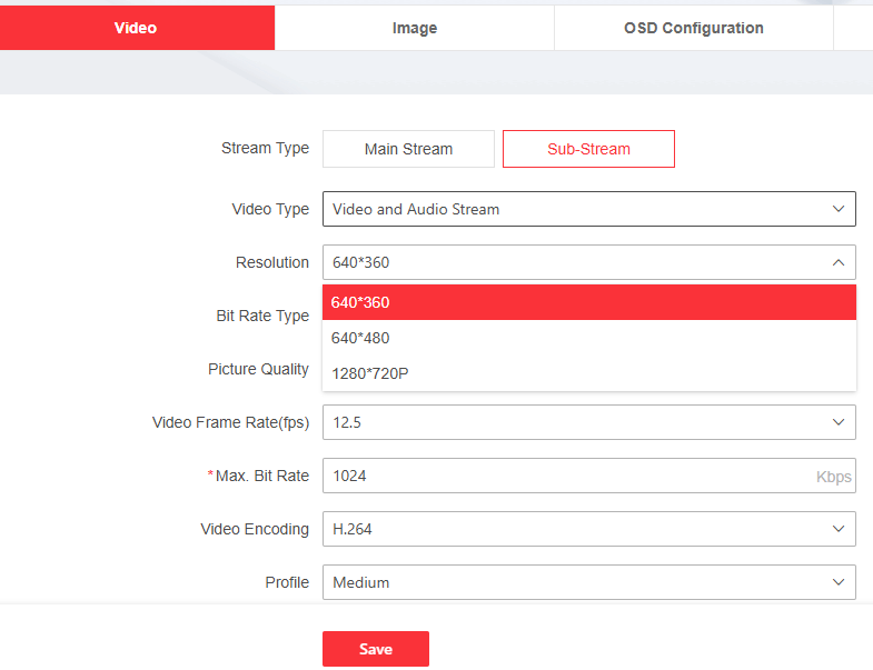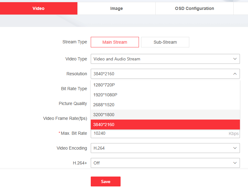 Please note the image-recording resolution is either the Main Stream or Sub-stream's video resolution. (you can configure which one to use later).
