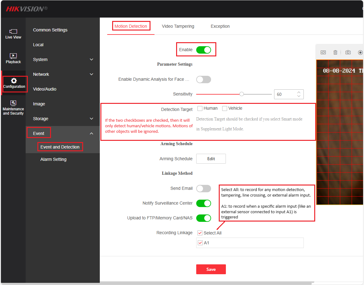 Enable Motion Detection. You can also set motion detection settings based on your needs,