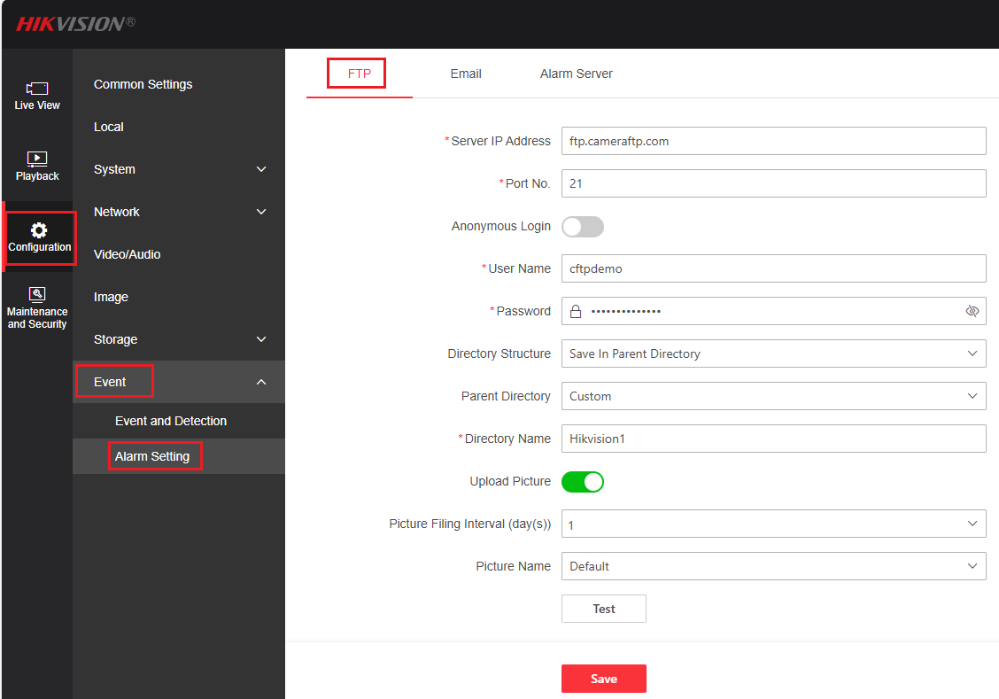 Note: Hikvision cameras cannot upload video clips to FTP server directly. To upload video clips, you can use CameraFTP VSS on a PC.