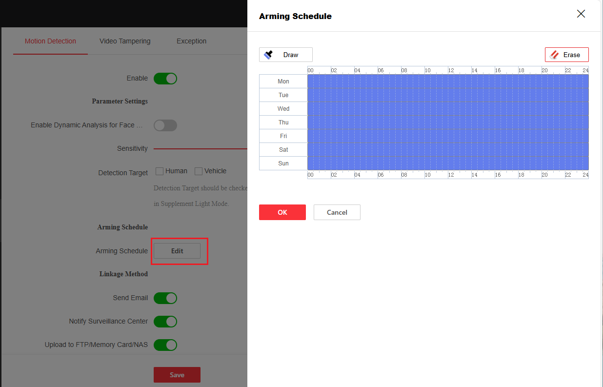 You need to set Motion Detection Arming Schedule. Click "Arming Schedule", you will see the screen as follows:
