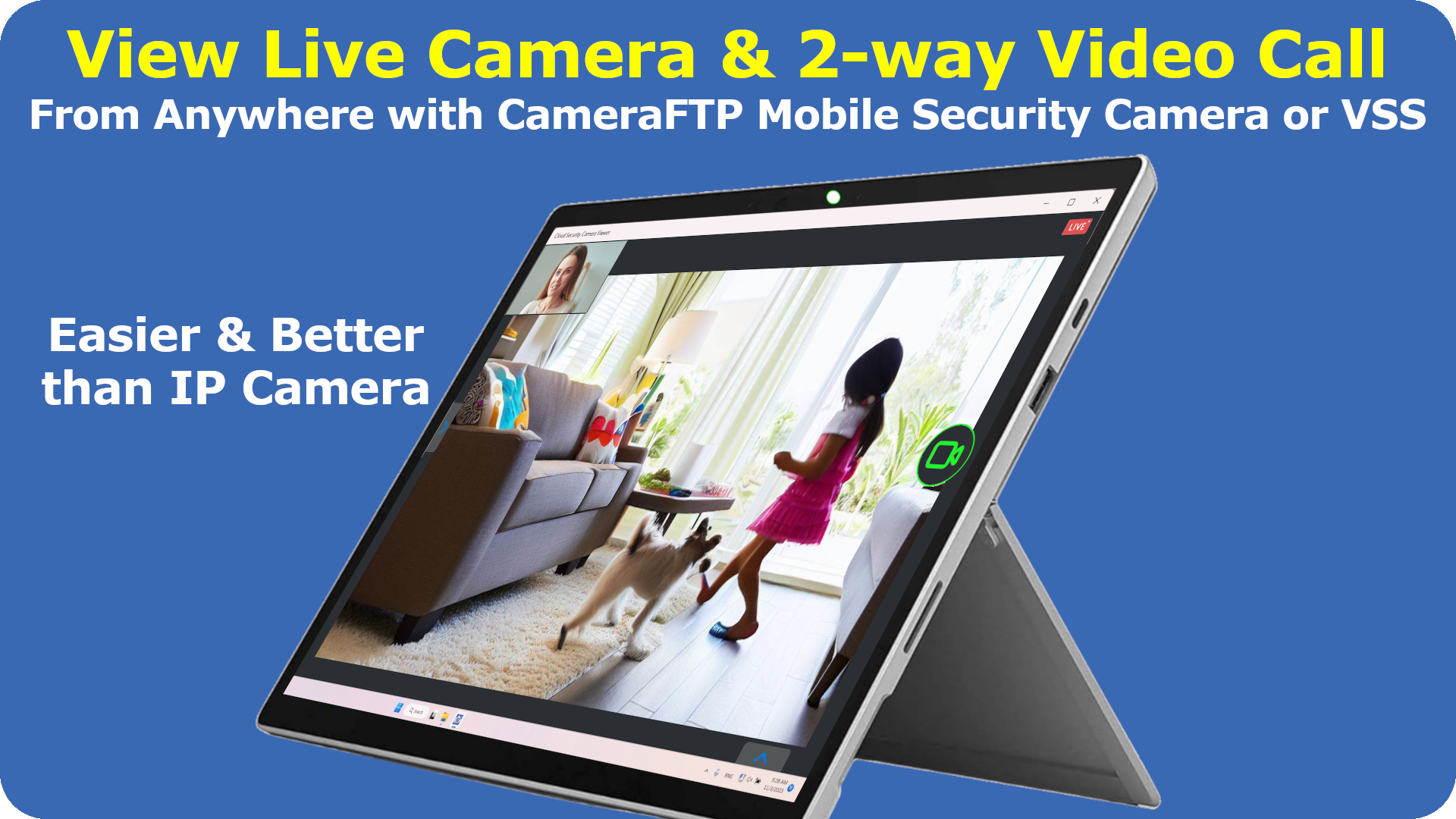You can also use smartphone, tablet or laptop/PC as security camera. To use smartphone as security camera, please install CameraFTP Mobile Security Camera app; to use webcam as security camera, please install CameraFTP VSS software.