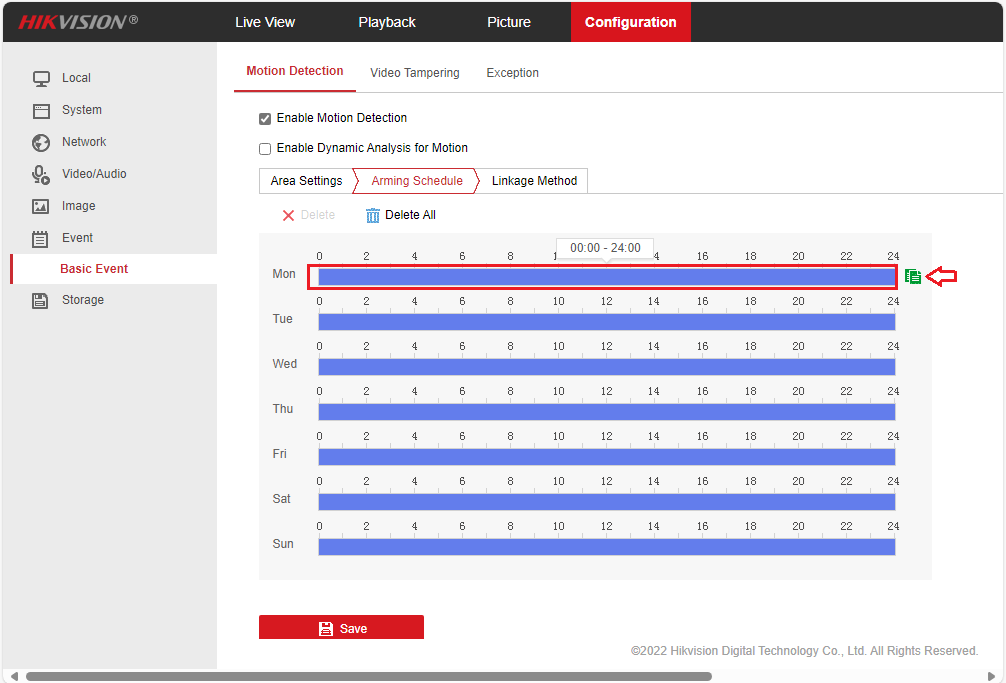 You need to set Motion Detection Arming Schedule. Click "Arming Schedule", you will see the screen as follows: