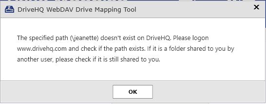 If we are referring to folders that have been shared to your users, then the folders are within the shared directory. So, the direct path for connecting to the folder in question per your screenshot would be: \drivehqshare\mleydekkers\jeanette. If you enter this, then you should not have any further issue.