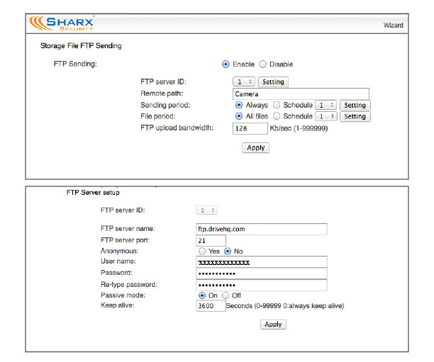I have setup a security camera for a neighbor and would like to use DriveHQ to give my neighbor an easy access to the movies from the camera on her Mac. However, the automatic ftp upload from the camera to DriveHQ seems not to work (but it does work if I configure the camera to upload to a folder on my webserver).