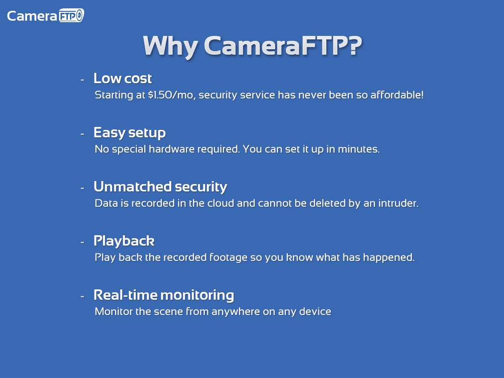 CameraFTP Mobile Security Camera is NOT a standalone app, it is part of CameraFTP's Home & Business Security service.